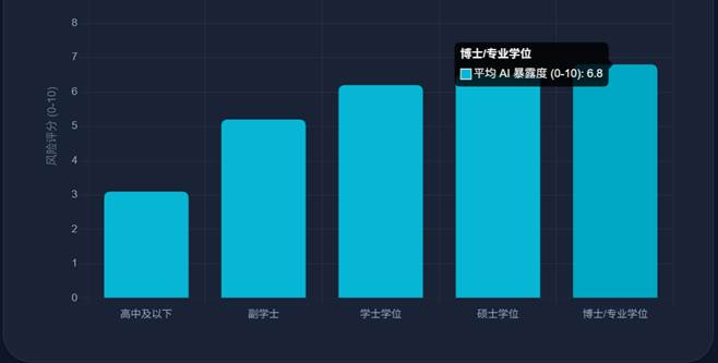 数据无情地指出:要求拥有硕士或博士/专业学位的岗位,其平均 AI 风险度评分分别高达 6.5 和 6.8。相比之下,仅需高中及以下学历的工作,平均风险仅为 3.1。