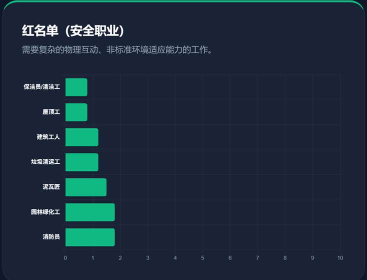 - 保洁员 (0.8分) / 屋顶工 (0.8分) / 消防员 (1.8分): 这些职业被视为出人意料的“铁饭碗”。