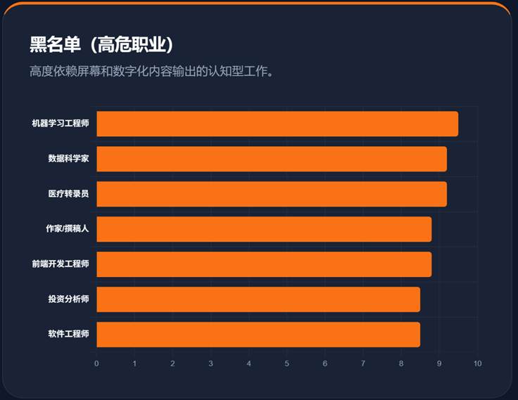 - 机器学习工程师 (9.5分) / 数据科学家 (9.2分): 讽刺的是,亲手缔造 AI 的硅谷精英们正成为第一批受冲击的人。代码生成和自动化建模已经极其成熟。